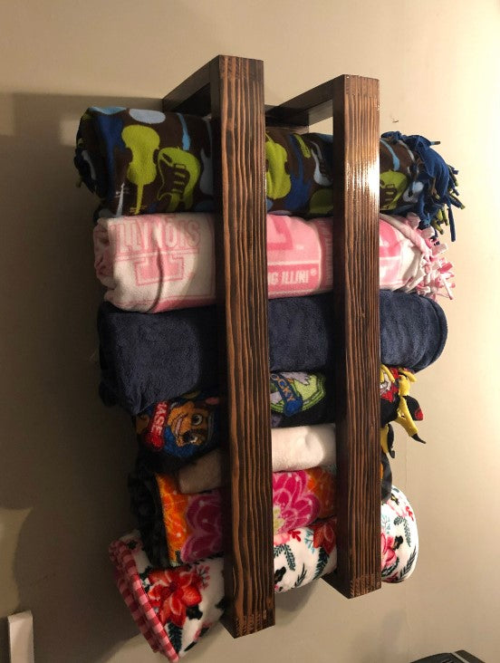 A twist on the traditional blanket rack. These solid wooden, wall mounted racks are a creative way to store your blankets or towels. Choose your size and wood species. Can be unfinished, painted, or stained. All systems include hardware.